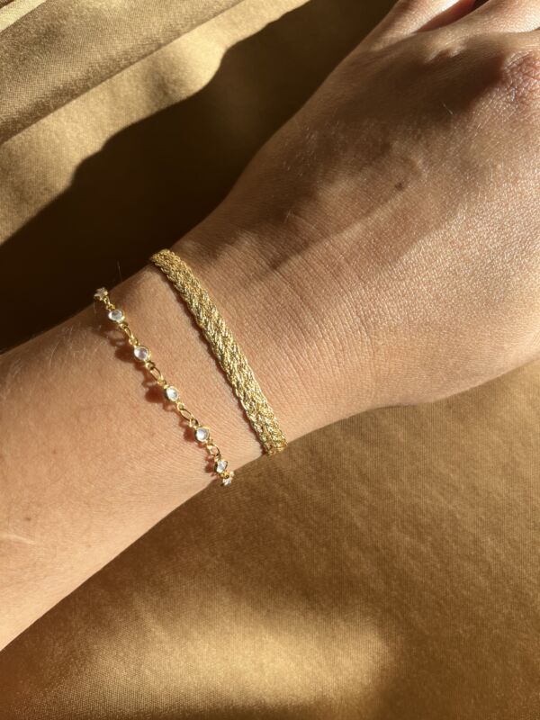 Dieses Bracelet ist 15 cm lang und besitzt eine Verlängerung von 3 cm. Die maximal Länge beträgt 18 cm. Aus Messing vergoldet (24 Karat, 3 Mikron) und bestens verträglich.