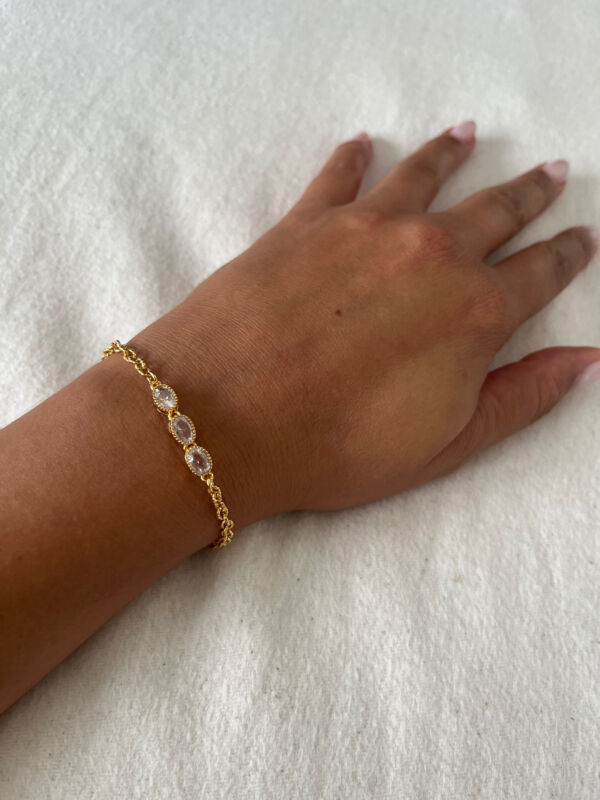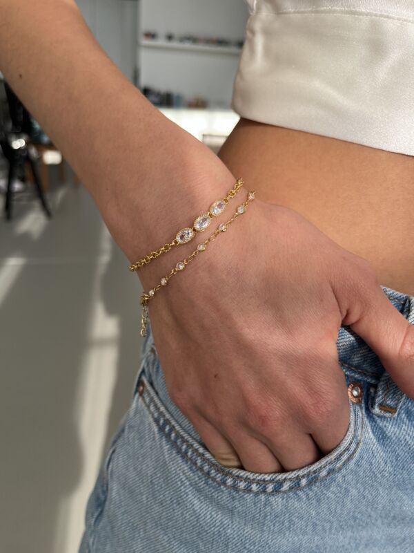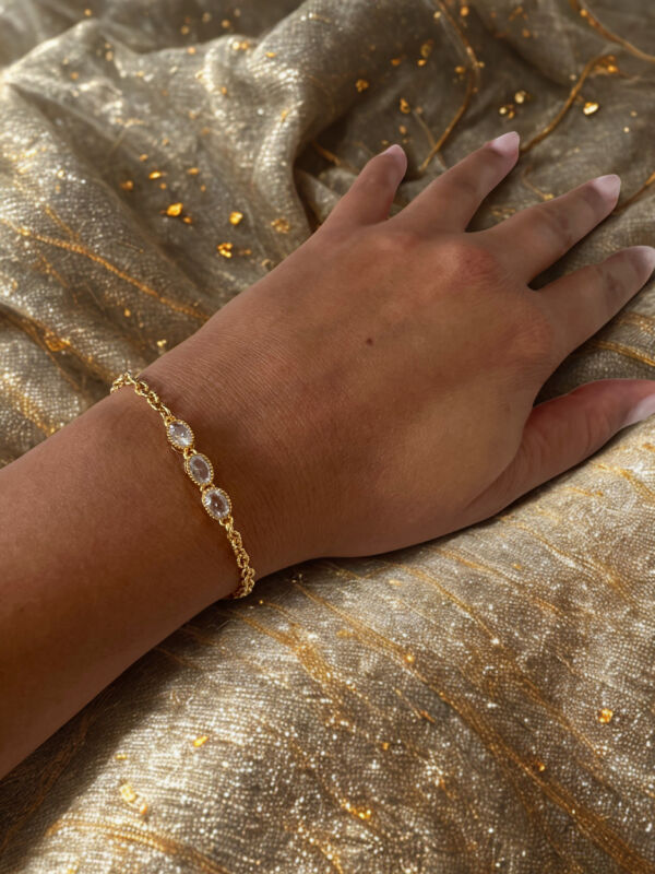 Das Bairo Armband goldig mit drei Zirkonia ist ein bezauberndes, wunderschönes Armschmuckstück welches super geeignet ist um mit anderen Armbändern zu tragen. Das raffinierte Design und die feine Verarbeitung machen dieses Armband zu einem stylischen Begleiter für jede Lebenslage. Ob am Strand, im Office oder Abends zum Ausgehen, du wirst dieses Armband immer tragen weil es überall, zu jedem Outfit und jedem Anlass passt. Die eleganten Zirkonia Steine verleihen dem Armband eine Prise Glamour und darum ist dieses hübsche Bracelet auch bestens geeignet um einen eleganten oder festlichen Style zu kreieren.