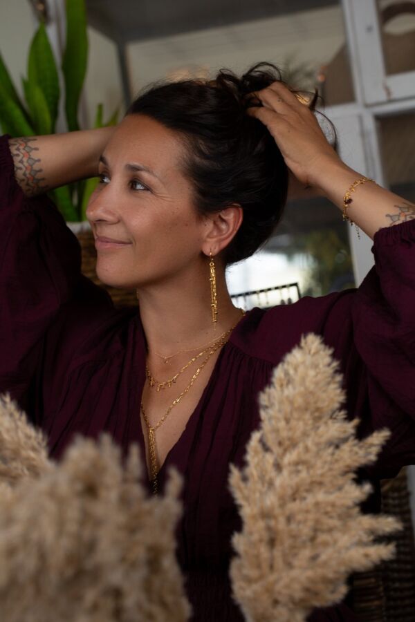 Diese Ohrhänger sind aus Messing und 3 Mikron stark mit 18K Gelbgold vergoldet. Dadurch behalten sie ihre Farbe und sind auch für empfindliche Ohren geeignet.
