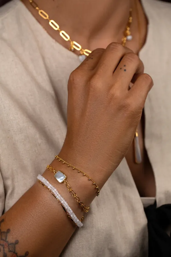 Das Bairo Pop Armband goldig ist ein bezauberndes Armschmuckstück welches auch super geeignet ist um mit anderen Armbändern zu tragen. Das raffinierte Design und die feine Verarbeitung machen dieses Armband zu einem stylischen Begleiter für jede Lebenslage. Ob am Strand, im Office oder Abends zum Ausgehen, du wirst diese bezaubernde Armband immer tragen weil es überall, zu jedem Outfit und jedem Anlass passt.