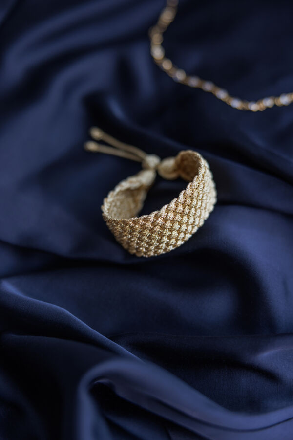 Hergestellt werden die Maayaz Armbänder aus Goldfäden die man in Marokko «sfifa» nennt. Traditionell werden die Fäden verwendet, um das marokkanische Kleid, den Kaftan, zu besticken. Dank des beweglichen Knotens kann das Bracelet auf jede Größe zwischen 14 und 21 cm eingestellt werden.