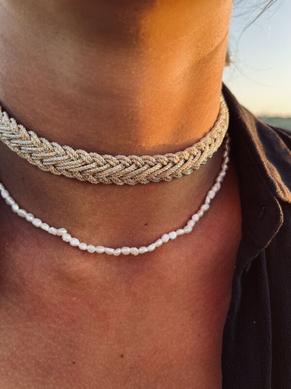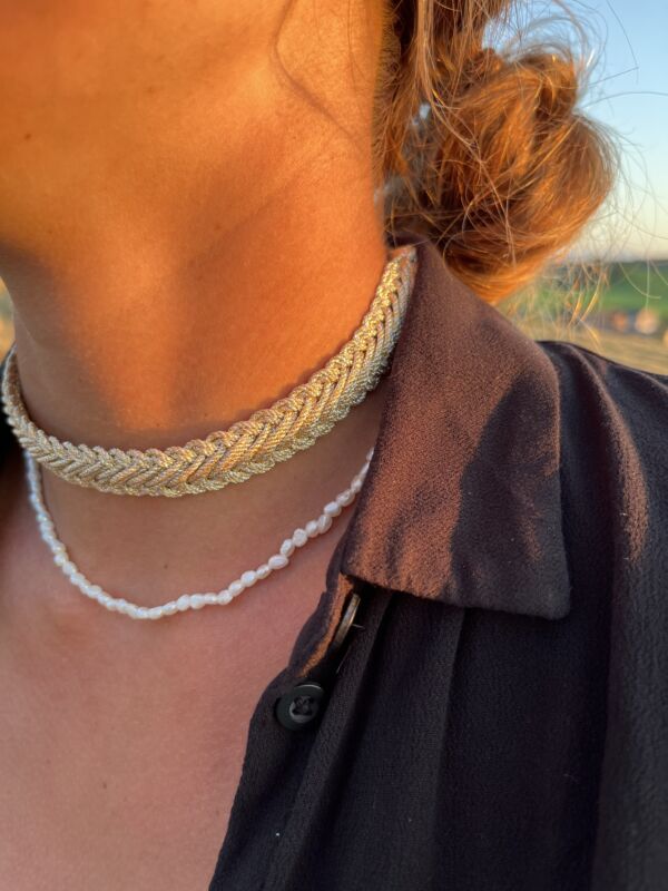 Der Maayaz Choker Azal in Silbergold ist ein umwerfendes und besonderes Statement-Piece. Das einzigartige Zusammenspiel von Farbe, Textur, Form und Material verleiht diesem Schmuckstück eine bezaubernde Tiefe und Raffinesse. Die silbergoldene Farbe passt hervorragend zu allen beige Tönen und verleiht jedem Look eine besonderen Note. Mit diesem Choker wird jeder Look zu einem Highlight. Wenn du ein Halsschmuckstück suchst dass ganz anders ist als alles andere und welches gleichzeitig cool und glamourös ist, dann ist dieser wunderschöne Chocker von Maayaz genau das Richtige!