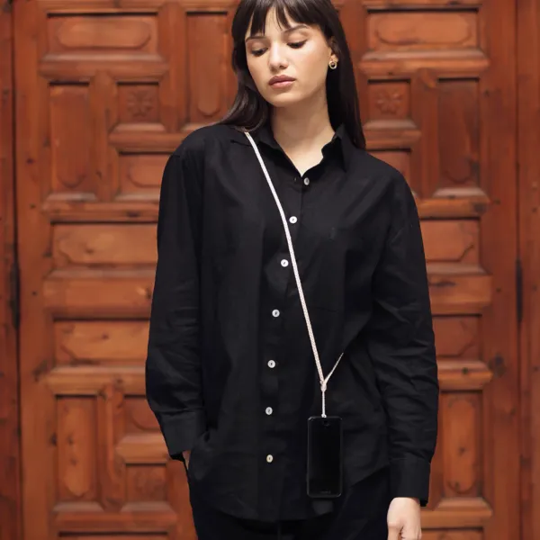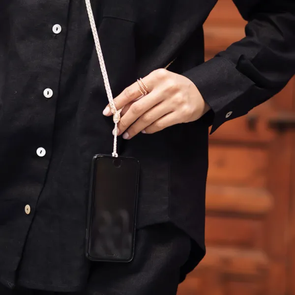 Die Maayaz Handykette hat eine Gesamtlänge von 78 cm und eine Breite von ca. 6 mm. Sie ist dank eines beweglichen Knotens auf verschiedene Längen verstellbar.