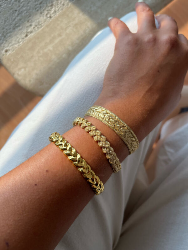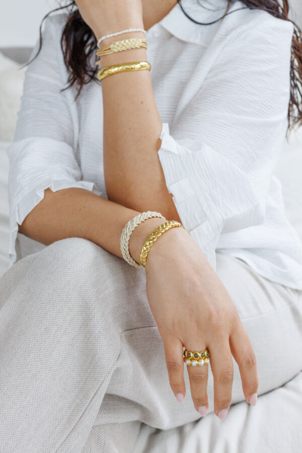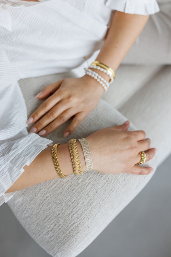 Der Pink Sand Armreif goldig mit Zopfmuster ist super angenehm zum Tragen mit einer tollen Haptik und ist extrem hochwertig verarbeitet. Darum wird dich dieses Armschmuckstück begeistern! Der Armreif ist so vielseitig kombinierbar gerade auch mit den tollen Maayaz Armbänder, du wirst diesen Armreif einfach lieben ! Er passt zu jedem Style und Look und wertet dein Outfit sofort auf. Ein umwerfend schöner Armreif mit der nötigen Portion Coolness den jede Frau in ihrem Schmuck Repertoire braucht. Kombiniere den Armreif mit deinen bestehenden Schmuckstücken, trage ihn alleine oder stell dir gleich dein individuelles Set mit einem der tollen Maayaz Armbänder zusammen. Egal wie und mit was du wirst diesen supercoolen, goldigen Armreif von Pink Sand immer wieder und zu allem tragen! Die Schmuckstücke von Pink Sand sind übrigens 3 Mikron stark vergoldet das heisst dass der Armreif seine Farbe behält.