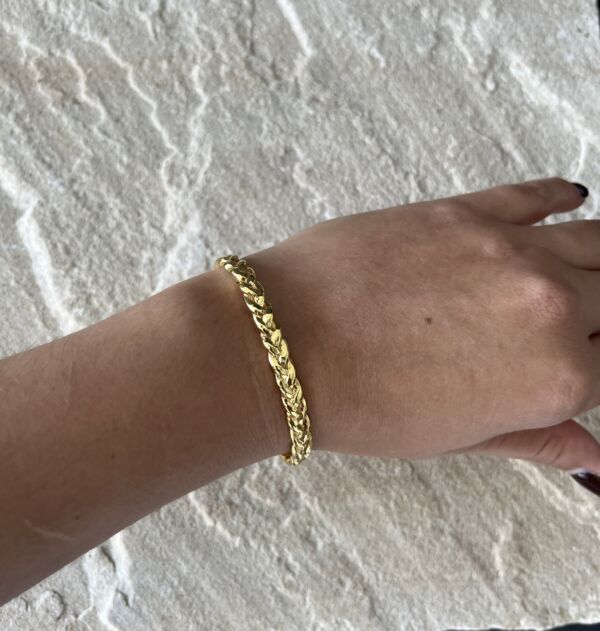 Der Pink Sand Armreif Zopfmuster schmal goldig, ist ein wunderschönes und edles Armschmuckstück dass dich begeistern wird! Der Armreif ist so vielseitig kombinierbar gerade auch mit den tollen Maayaz Armbänder, du wirst diesen Armreif einfach lieben ! Er passt zu jedem Style und Look und wertet dein Outfit sofort auf. Ein umwerfend schöner Armreif mit der nötigen Portion Coolness den jede Frau in ihrem Schmuck Repertoire braucht. Kombiniere den Armreif mit deinen bestehenden Schmuckstücken, trage ihn alleine oder stell dir gleich dein individuelles Set mit einem der tollen Maayaz Armbänder zusammen. Egal wie und mit was du wirst diesen supercoolen, goldigen Armreif in Zopfoptik von Pink Sand immer wieder und zu allem tragen! Die Schmuckstücke von Pink Sand sind übrigens 18 Karat und 3 Mikron stark vergoldet das heisst dass der Armreif seine Farbe behält.