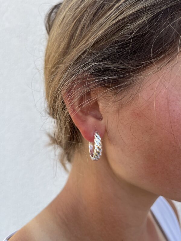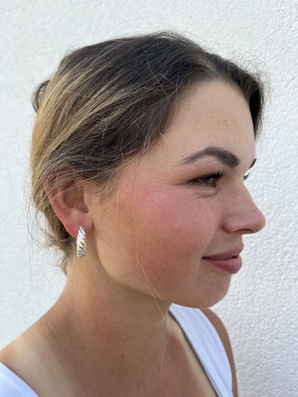 Die Pink Sand Creole Midi Twister in Silber, passen super zu Business & Freizeit Looks und verleihen deinem Outfit eine sportlich elegante Note. Ein zeitloser Klassiker mit dem du nie over- / underdressed bist. Diese tollen Ohrschmuckstücke passen also zu jedem Style und jedem Anlass. Ein super Basic für deine Schmuckgarderobe und auch ein tolles Geschenk für jedes Alter. Durch die leichte Hämmerung und die leicht gewölbte Optik bekommen diese Creolen etwas Volumen, sind dabei aber trotzdem fein und sehr leicht zum Tragen.