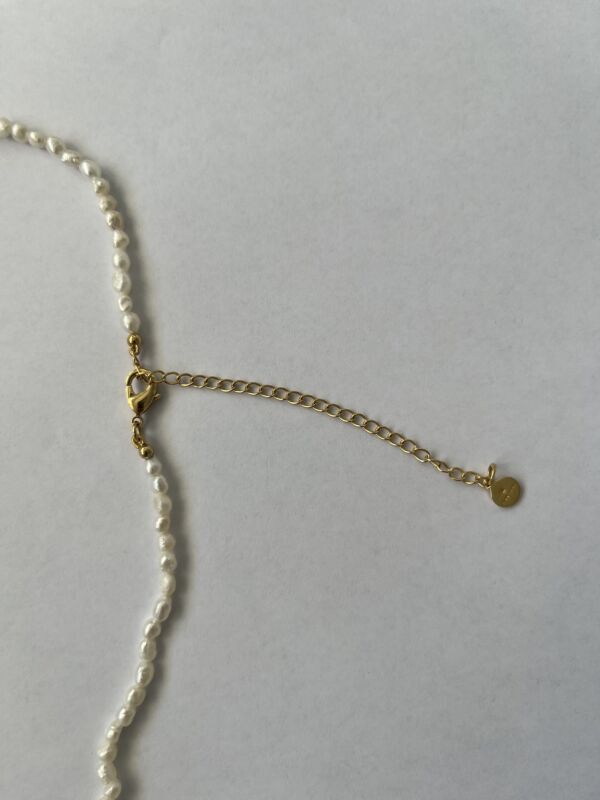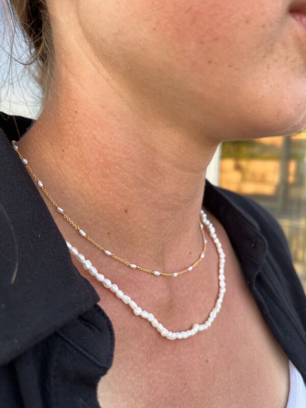 Diese Halskette besteht aus Süsswasser Perlen mit 3 Mikron starker 18K Gelbgold Beschichtung auf Messing. Dadurch ist sie bestens verträglich und behält ihre Farbe.